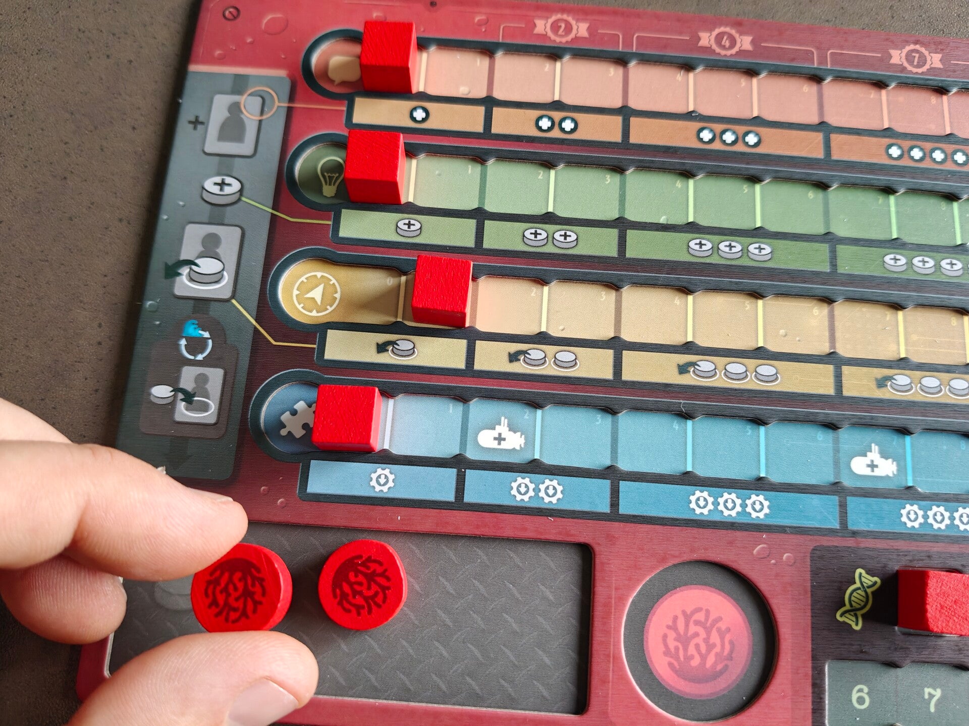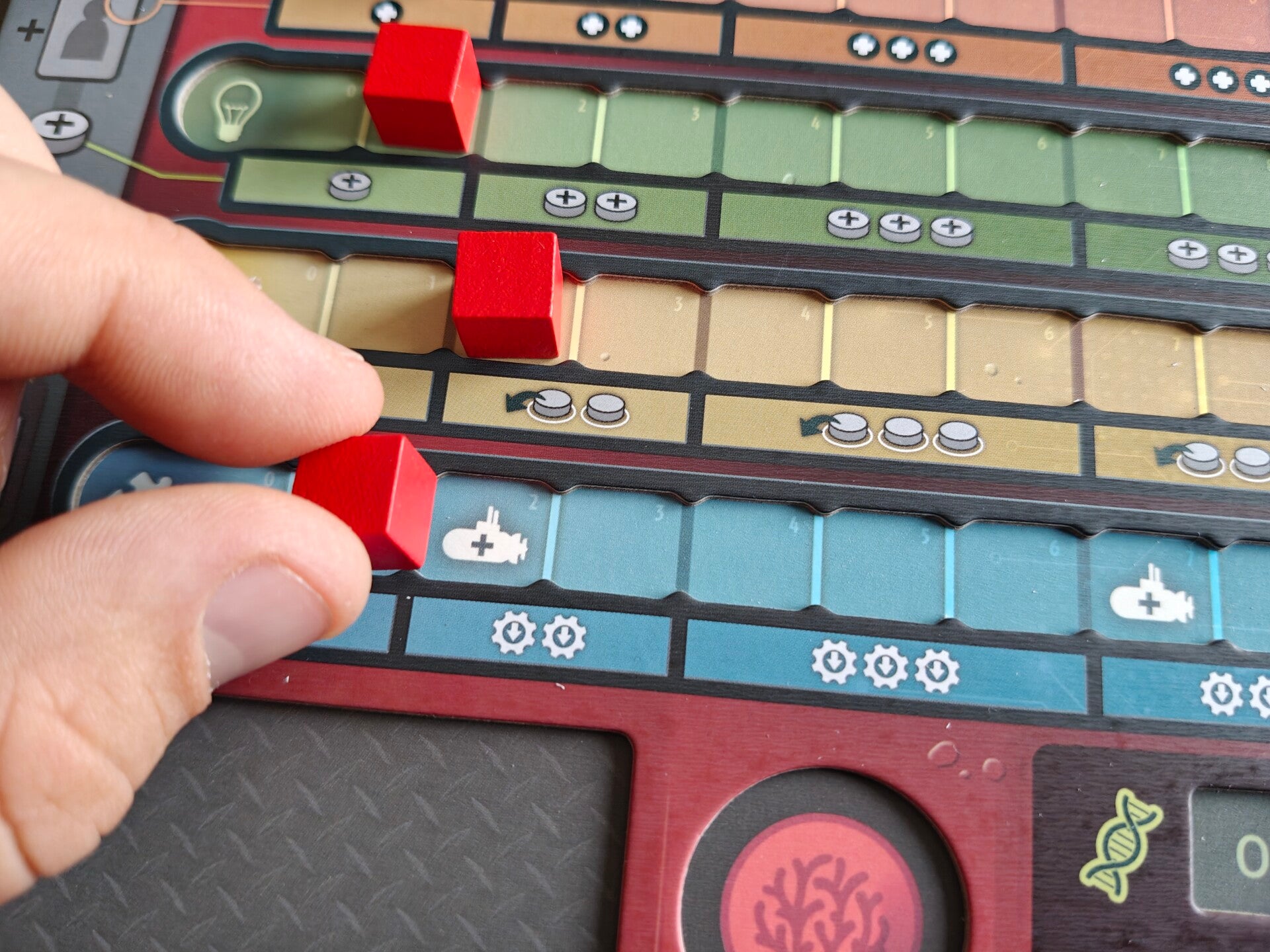 1. 2 stappen op het vindingrijkheidsspoor. Hierdoor spelen we een 2de duikboot vrij. Deze plaatsen we op de lanceerzone van de missie, waardoor we weer een aankomstbonus van 1 schijf verkrijgen, die we in ons opslaggebied leggen.
