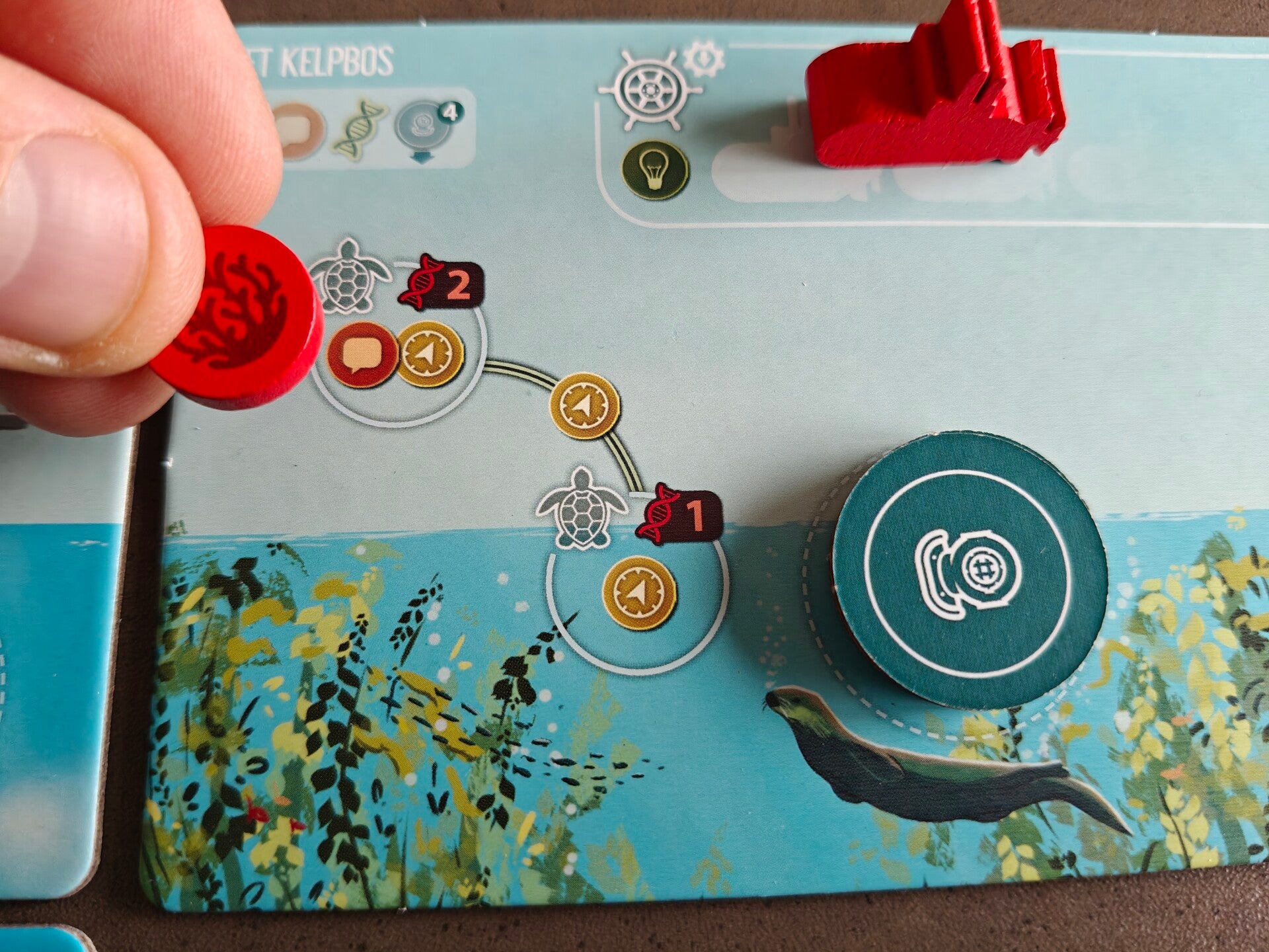 In dit voorbeeld gaan we deze actie uitvoeren in het kelpbos. We kiezen 1 van de 2 beschikbare plaatsen voor deze actie. Wij hebben net een duikfiche bewaard waarmee we 4 stappen kunnen doen op het onderzoeksspoor. We leveren deze fiche in en kunnen dan de 2 nodige onderzoekskosten betalen. Als bonus krijgen we een stap op het reputatie- en het coördinatiespoor.