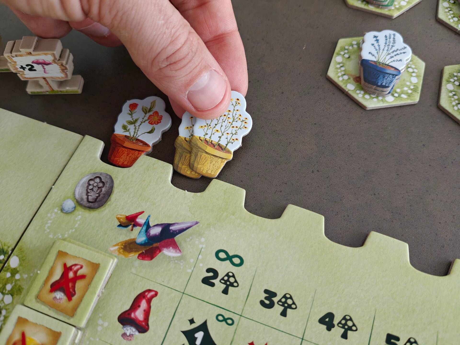 2. Bezoek de bloemenmarkt: je verplaatst een gnoom naar de bloemenmarkt, links bovenaan het marktbord. Net als bij de ringmarkeerbonus, mag je nu een bloemfiche nemen van een soort die je nog niet hebt verzameld en deze toevoegen aan je bloemencollectie bovenaan je spelersbord. Alle gnomen kunnen hier geplaatst worden, deze locatie kan je dus niet blokkeren.