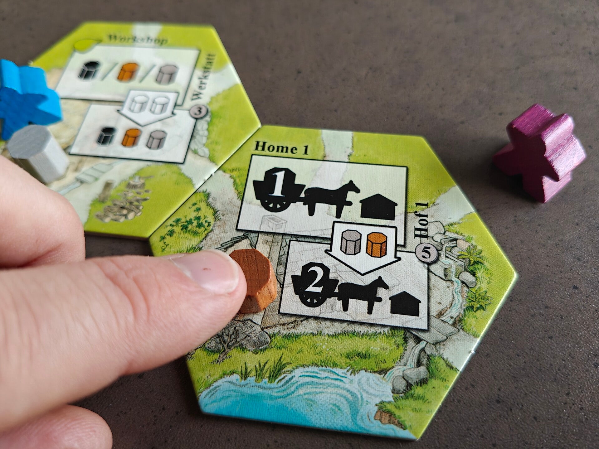 2. Grondstoffen verkregen van een tegel in het dorp van een andere speler of van een biedtegel in het speelveld, leg je op je thuis-tegel (foto 2).