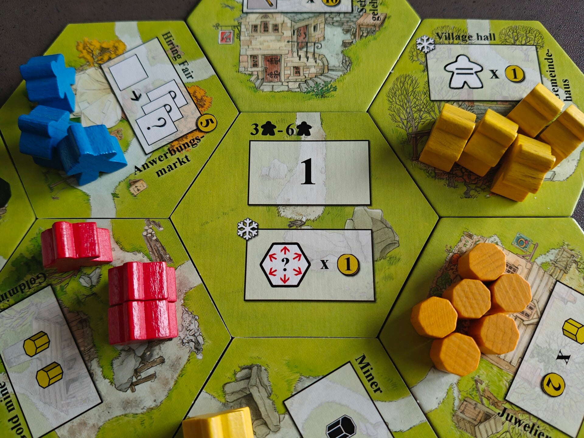 1. Alle arbeiders, waarmee geboden wordt, moeten dezelfde kleur hebben als alle andere arbeiders die al rond of op deze dorpstegel staan. Staan er nog geen arbeiders rond of op de tegel, dan bepaal jij nu welke kleur er voor deze tegel zal gebruikt worden (foto 1).