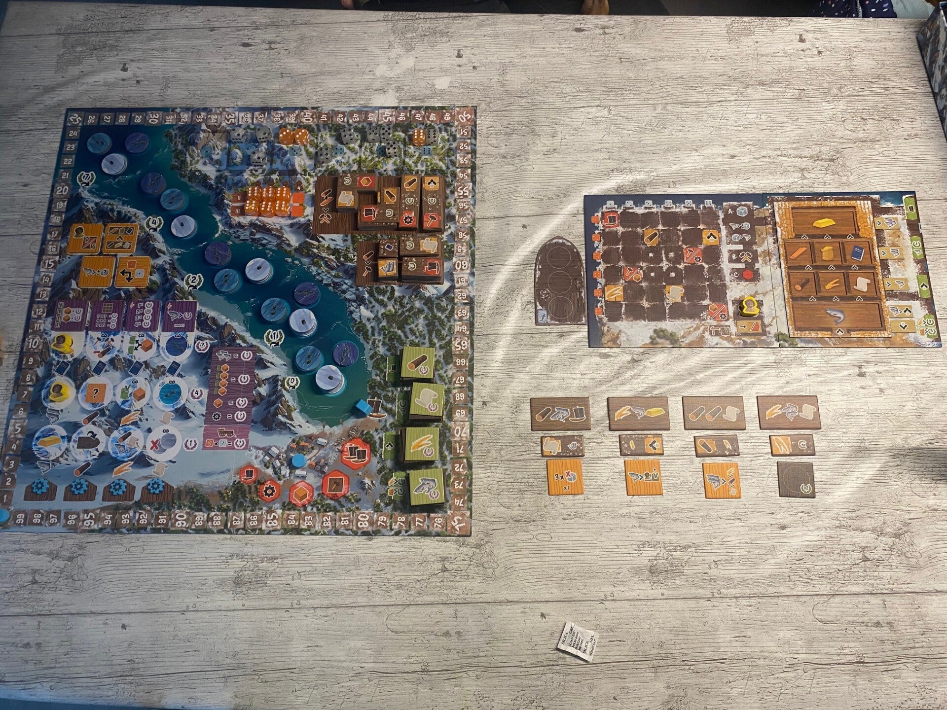 Elke speler kiest nu een startersset, beginnend met de speler rechts van de startspeler & in omgekeerde klokvolgorde. Elke speler plaatst zijn vaardigheidstegel naast het spelersbord. Deze vaardigheid heb je onmiddellijk voor de rest van het spel! De startgebouwtegel plaatst elke speler op zijn spelersbord, op 1 van de middenste 4 plaatsen (let op het sneeuwvlokje). Je mag de tegel leggen hoe je wil. Als laatste krijg je de startmiddelen, zoals aangegeven op de starttegel.